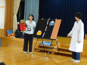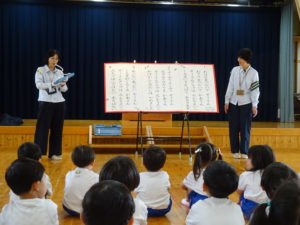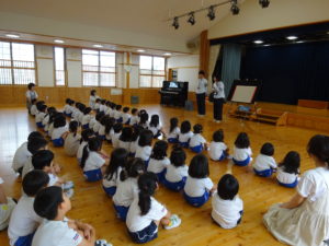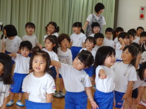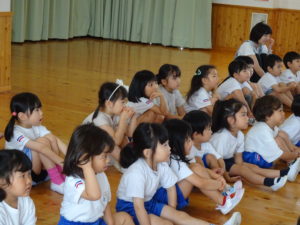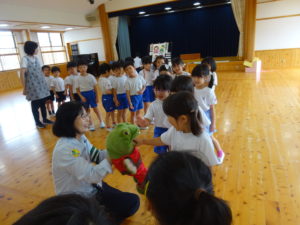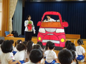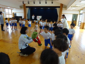 令和6年7月2日(木)ばら・ゆり・さくら組のお友達がホールでぞうさんクラブに参加しました。指導員の方に元気に挨拶をして、お話を聞いていましたよ。道路を歩くときは、お家の人と手をつなぐこと・歩道の内側を歩くこと、他にも、横断歩道の渡りかたや、信号についてのお話を聞きました。指導員の方が扮する交通博士が色々な質問をすると積極的に手をあげて発表してくれました。指導員の方の伴奏にあわせて「ぞうさんクラブのうた」も歌いましたよ。先後は、お話を盛り上げてくれたカエル君とひとりずつ握手をしてバイバイしました。秋にはまた、2回目のぞうさんクラブがあるので、今日のお約束を忘れずに参加できるといいなと思います。