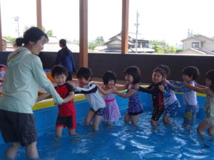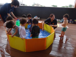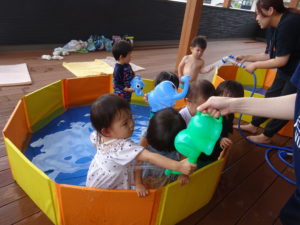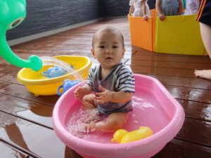 令和6年6月28日(金)プール開きがありました。この日は、ばら組・ゆり組のお友達がプールに入りました。7月に入ってからも、順番にもも組のお友だち、さくら組のお友だちが今年度初めてのプールあそびをしましたよ。2階のテラスは子ども達のはしゃぐ声で大賑わいです。ひよこ組やうさぎ組の小さいお友だちも初めての保育園のプールにドキドキしながらでしたが、少しずつお水に慣れてきて楽しそうな笑顔を見せてくれました。夏の本番はこれからです。思い切り、夏のあそびを楽しんでいきたいと思います。