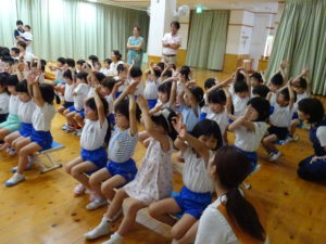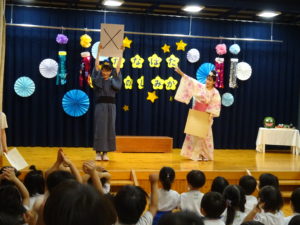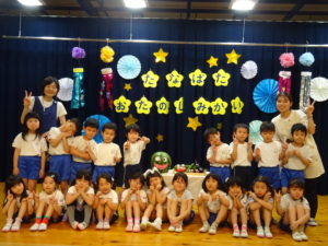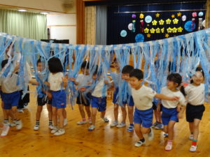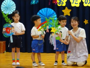 令和6年7月5日(金)ホールで七夕お楽しみ会を行いました。それぞれに願いを込めた短冊や素敵な七夕飾りを笹に飾り、準備も万端にして会に参加しました。「見えていますかお星さま」の歌をみんなでうたって七夕会がスタートしました。七夕の制作も各学年で色々な飾りが出来上がりました。クラスの代表のお友達が七夕飾りの紹介をしてくれましたよ。先生からのプレゼントアトラクションは七夕の由来の劇でした。小さいお友達には少し難しかったかもしれませんが、大きいお友達は真剣なまなざしで劇を観ていましたよ。最後は〇✖クイズで大盛り上がりです。正解するとお友達とハイタッチをしながら喜んでいました。お部屋に帰るときは、クラスごとに天の川をくぐってホールをあとにしました。みんなの願いが空に届くといいですね。