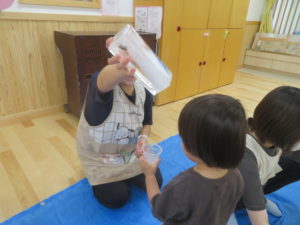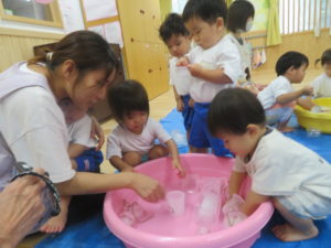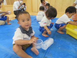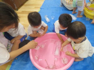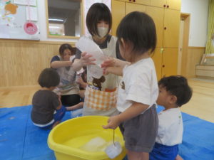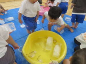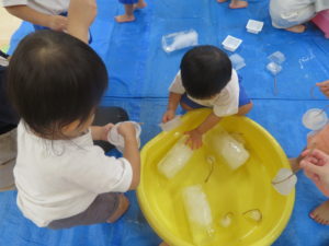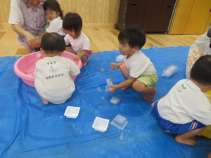 8月の終わりにうさぎ組で氷あそびをしました。色々な大きさの氷があり、紐がついていたので遊びやすく、すぐに手に取って遊び始めていました。はじめはあまり興味がなかったお友達も周りの様子をみながら遊びに参加し、ブルーシートの上で触っているとスーッと氷が滑ることに気づき夢中になっていましたよ。また、紐をもって氷を持ち上げると氷が解けていく様子をながめたり、そのしずくをカップに入れて遊んだり、それぞれが好きなように遊びを楽しんでいました。「つめたっ!!」と感触を言葉にして伝えてくれる姿もありましたよ。