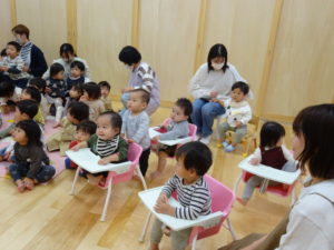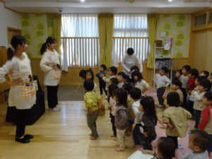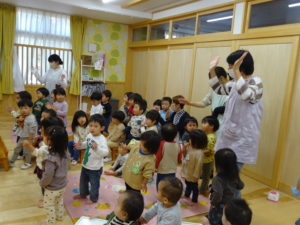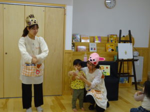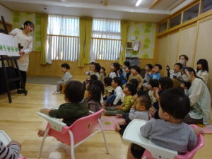 令和6年11月8日(金)わかばっこのお部屋でおはなし会がありました。もも組のお友だちの他にひよこ組で仲良しだったお友達も参加してくれました。今日はみんなの大好きな「おやつをたべよう」のお歌から始まりました。きまったポーズをしながら歌うのが楽しく、特にきりん組さんは喜んで盛り上がっていましたよ。大型絵本ではお馴染みの「だるまさんと」のおはなしで、だるまさんとフルーツのやり取りを一緒に楽しんでいました。そして、最後はリスさんとうさぎさんが登場し「不思議なジュース屋さん」の開店です。ミックスジュースの歌に合わせて魔法をかけると、不思議なジュースの出来上がり。うさぎの店員さんに代わって、何人かのおともだちがジュースつくりのお手伝いをしてくれました。とっても美味しいジュースが出来上がって、リスさん喜んでいましたね。次回のおはなし会は12月13日(金)です。たくさんのお友達の参加をお待ちしています。