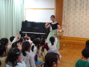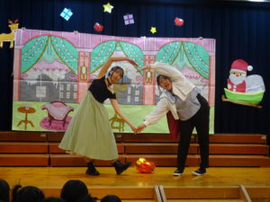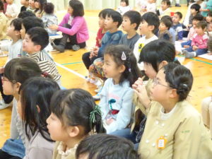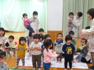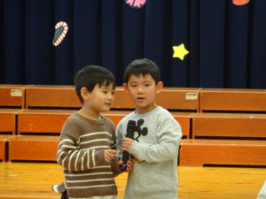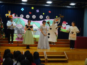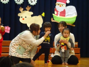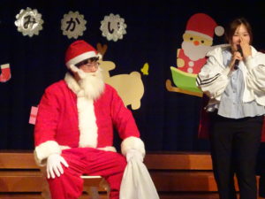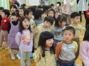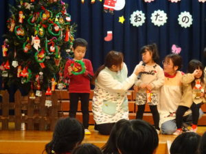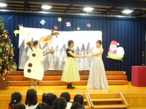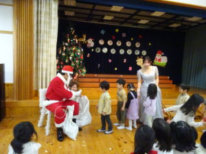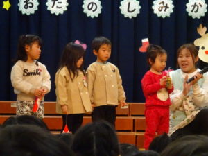 令和6年12月24日(火)全園児がホールに集まり、クリスマス会に参加しました。「あわてんぼうのサンタクロース」をみんなで歌って始まりです。もも組の小さいお友達も手拍子したり、リズムにのりながらかわいくお歌を歌ってくれましたよ。舞台の上にはお友達が制作したクリスマス飾りがツリーに飾られクリスマス会を盛り上げてくれていました。その飾りを各クラス、代表のお友達が紹介してくれました。いざ舞台のうえに上がると、緊張していたお友達もいましたがみんなで飾りを見て楽しむことができました。そして、みんなのお楽しみ、先生たちからのプレゼントアトラクションが始まりました。会場が暗くなると、舞台のカーテンからオラフが!!みんなその姿をみつけると大興奮!「アナと雪の女王」の物語の始まりです。アナやエルサの登場に目を輝かせていました。「せんせいかわいい!!」とあこがれの眼差しで見つめるお友達もいましたよ。エンディングでは子ども達から大きな拍手が送られ先生たちも嬉しそうでした。すると、どこからか鈴の音が・・・・サンタさんがやってきました!!サンタさんの姿にみんな釘づけです。さくら組・ゆり組のお友だちから、サンタさんに質問もしました。「プレゼントのおもちゃはどこでつくっていますか?」と尋ねると、「サンタの工場でつくっているよ!」と教えてもらいましたよ。サンタさんと握手をしたり、記念撮影もしました。忙しいサンタさんは次に待っているお友だちのところに行かなければならないのでこれでお別れでしたが、「サンタさんまたきてね!」「プレゼントありがとう!」と声をかけ、「来年もきてね!」と約束をしていました。さあ、みんなのお家にもサンタさん、きてくれたかな?