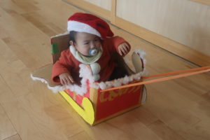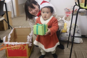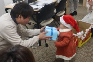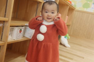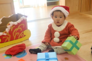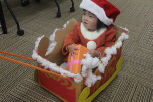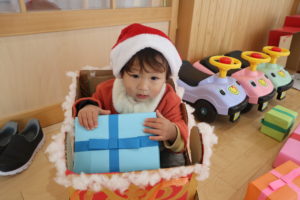 クリスマス会の翌日12月25日(水)、ひよこ組のお友達がそりに乗って事務室の職員にプレゼントを届けに来てくれました。赤い帽子に赤い服・・・かわいいサンタさんの衣装をきてそりに乗る姿は、何とも言えないほどかわいい姿でした。ギャラリーの先生たちも集まって囲まれたこともあり緊張していたお友だちもいましたが、そりからおりてトコトコトコと歩き、プレゼントを渡してくれました。園長先生に「ありがと~」と言われると、にっこり。またそりにのってお部屋に戻っていきました。かわいいひよこサンタさんたち、ありがとう!!