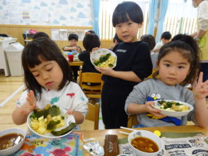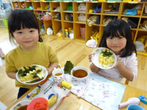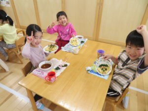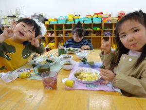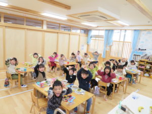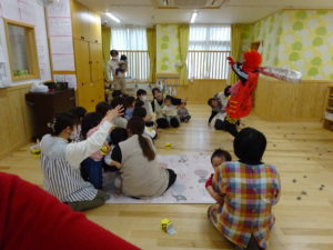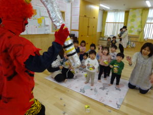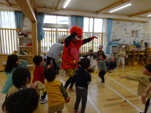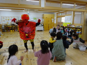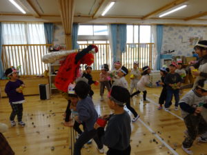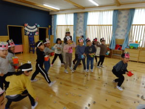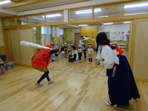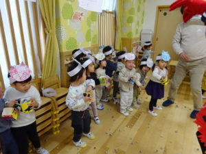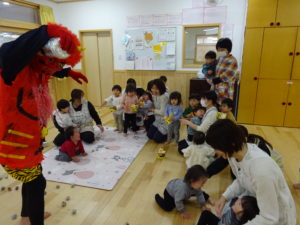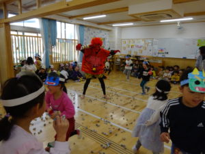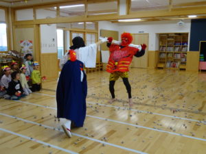 令和7年2月3日(月)一日遅れでしたが、保育園で豆まきを行いました。先月、鬼さんから、「保育園に遊びにいくぞ!」と、手紙が届いておりましたが、今年度も赤鬼さんがやってきましたよ。太鼓の音が鳴ると、各保育室に鬼さんが・・・来ることはわかっていたし、豆も手に持ち準備はしていましたが、やっぱり怖かったね。。もも組さんは保育士の後ろに隠れながら豆まきするお友達が多かったですが、中には勇敢に鬼に立ち向かっていくお友だちもいましたよ。2階小ホールでは、ばら・ゆり・さくら組が集まり、鬼がやってくると順番に豆まきをしました。豆を投げ、鬼が振り返ると猛ダッシュ!!逃げ足の速さにビックリ!!頑張って豆まきすることができました。そして、最後にやってきたのは、福の神のお福さん。お福さんの姿をみると、どこか安心した表情の子ども達でした。お福さんと鬼さんの対決も見ごたえがありましたね。給食では毎年恒例の鬼ご飯!それぞれ、のりやウインナ―の具材をつかって鬼ご飯を作りました。鬼は怖いけど、鬼ご飯はおいしかったね。あっ!!そうそう。鬼さん、金棒を保育園に忘れていってしまいました。きっとまた、来年とりにくるかな。。。