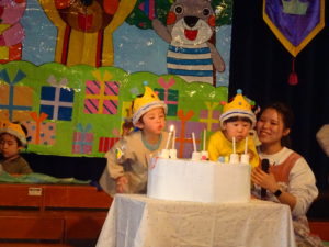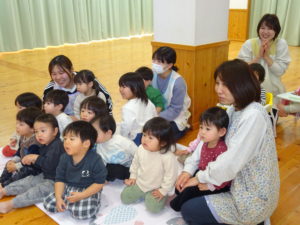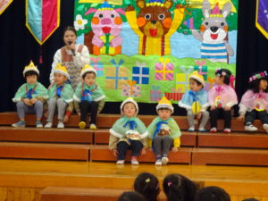 令和7年2月21日(金)2月生まれのお誕生会をホールで行いました。今月は小さいクラスの誕生児のお友達がいなかったのですが、全園児でお祝いをしていつものように盛り上がっていました。将来の夢では、警察官、好きな遊びは色々な種類の鬼ごっこが人気でしたよ。先生からのプレゼントアトラクションは「3匹のこぶた」のエプロンシアターでした。よく知っているお話だったのでストーリーを思い浮かべながら楽しむことができました。エプロンシアターのお話ですが、狼役は保育士がお面、マントをつけて登場したのでちょっとびっくり!!怖くて泣き出してしまったもも組さんもいましたが、先生の陰にかくれながら、興味津々で見入っていました。来月は今年度最後のお誕生会。みんなでホールに集まり、誕生児のお友だちを温かくお祝いして楽しみたいと思います。