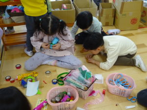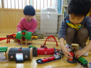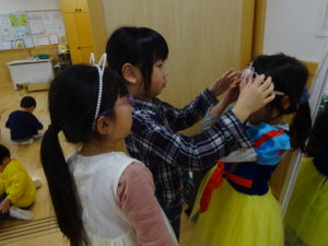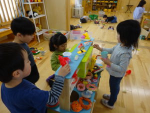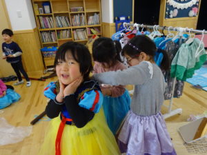 令和7年3月14日(金)ばら・ゆり・さくら組で、FREEDAYとして、縦割り保育で遊びました。色々なコーナー遊びがあり、どこであそぼうか迷っている様子も。保護者の方からもご協力いただき素敵な衣装コーナーが出来上がりました。思い思いに好きなコーナーに行き夢中になって遊んでいましたよ。お昼はテラスでランチタイムです。11時半から13時までの間に食事を済ませるように伝えると、友だちと誘い合ったり、テラスが満席の様子をチェックすると、時間をずらして準備をするなど、自分で考えて行動する姿がみられました。午後からも好きなコーナーで遊んだり、園庭で遊んだり目一杯遊んで楽しんでいました。これからも、子ども達が自ら考え、行動しあそび見込める環境を一緒に考えていきたいと思います。