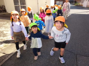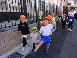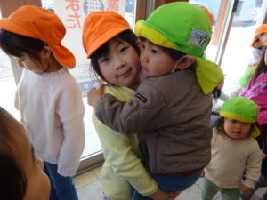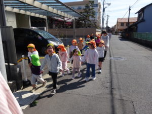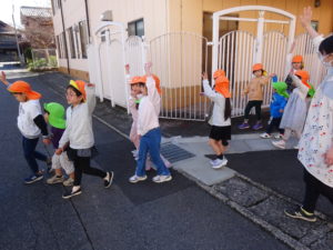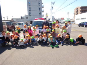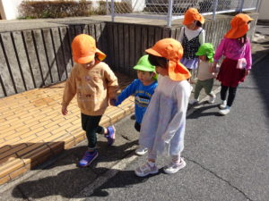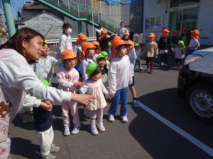 令和7年3月18日(火)うさぎ組とさくら組で一緒に交番までお散歩に出かけました。少し風が強かったのですが、日差しは暖かくお散歩日和でしたね。うさぎ組の小さいお友達もさくら組のお兄さんお姉さんと一緒に行けることを楽しみにしていて仲良く手をつないでお散歩に出かけることができました。交番ではパトカーを見せてもらい、これにはさくら組さんも大興奮でした。最後はパトカーの前で記念撮影。みんなの笑顔がとても素敵でした。