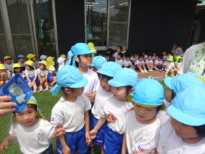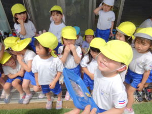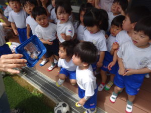 ばら組のお友だちが、以前あおむしを保育園にもってきてくれました。玄関の生き物コーナーに置いておくと、みんな興味津々。あおむしからさなぎへ・・・変身する様子を大事に大事に見守っていてくれました。さなぎになると、「あっ!せんせい、いろがすこしかわってきたよ!」と、観察も熱心でした。土曜日はまださなぎだったのですが、月曜日登園すると、蝶々に変身していました。その姿、様子にまたまた大興奮!! 羽が乾いて、空に飛びたてるまで少し見守り、雨上がりの今日、園庭にみんなで集まり、蝶々を見送りました。「げんきでね~!!」と蝶々に手を振る子ども達の笑顔はキラキラでしたよ。