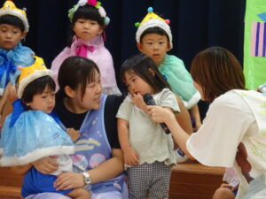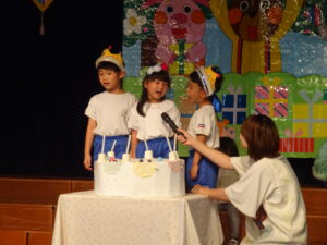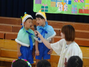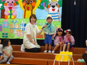 令和7年8月22日(金)ホールで8月生まれのお誕生会を行いました。お休みのお友だちもいたので10人のお誕生児のお友だちでしたが、舞台の上に上がると嬉しそうにクラスのお友だちに手を振っていましたよ。今日はもも組の小さいお友だちから発表してもらいました。好きな食べ物を先生と一緒に教えてくれましたよ。ばら組のお友だちはとても大きな声で「ぶどうとみかんとバナナです!」と上手に発表することができました。年長さくら組は将来の夢で、「マリオ」「ケーキ屋さん」「カウボーイ」と様々でした。「どうしてカウボーイになりたいの?」という質問には「馬に乗りたいから」と、教えてくれました。かわいいですね!先生からのプレゼントアトラクションは「へんしんトンネル」でした。何人かのお友だちがへんしんトンネルの中に入りました。りく君が入ると、くりになって出てきたり、りのちゃんが入ると、のりになって出てきたりで、見ていたお友だちは「おもしろーい!!」と大喜びでした。「もっとやってー!!」とリクエストも。。。楽しい誕生会でしたね。