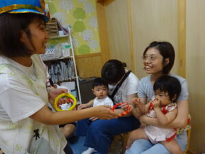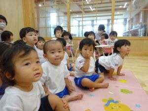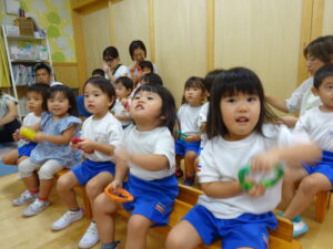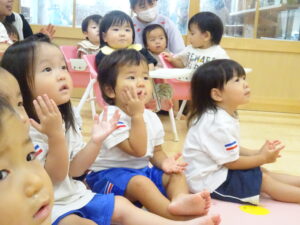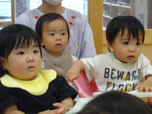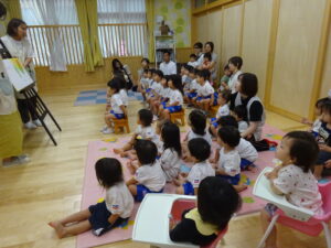 令和7年9月12日(金)、未就園児のお友だちを対象におはなし会がありました。もも組のお友だちと一緒に先生たちのお話を一緒に見たり、歌ったりして楽しみましたよ。今日のおはなしは、「バルボンさんのお出かけ」ワニのバルボンさんがバスに乗ってお出かけするお話でした。絵本が終わると先生たちがバスの運転手さんに変身して登場。お友だちにも、かわいいハンドルが渡され気分は本物の運転手さん!「バスの乗って」の歌に合わせてみんなで右に曲がったり、左に曲がったり、デコボコ道を走ったり、大盛り上がりでした。楽しい時間はあっという間に過ぎてしまいましたが、楽しそうに笑うかわいい笑顔がたくさんでした。次回も、楽しみにしていてくださいね。