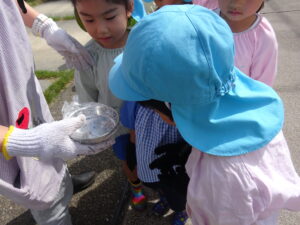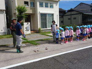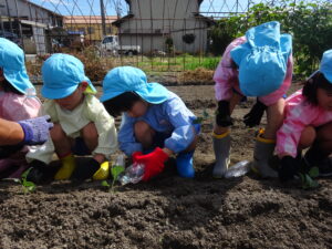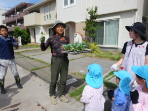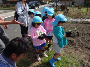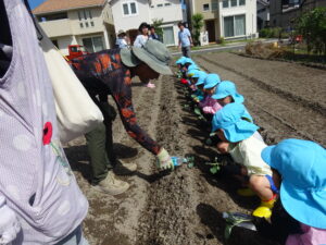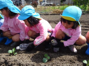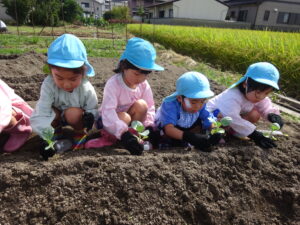 令和7年9月26日(金)年長さくら組のお友だちが、ブロッコリーの苗植えに出かけました。二村まひろ君・ふうかちゃんのおじいちゃん、おばあちゃん、JA厚見支店の支店長さんにお世話になり保育園近隣の畑で行いました。ブロッコリーの苗を一人一つずつ手のひらにそっとのせ、そーっと土の上に置きました。ペットボトルのお水をかけて無事に苗植えが終了しました。まひろ君・ふうかちゃんのおじいちゃん、おばあちゃん、支店長さん、貴重な体験をすることができました。お世話になり、ありがとうございました。