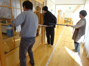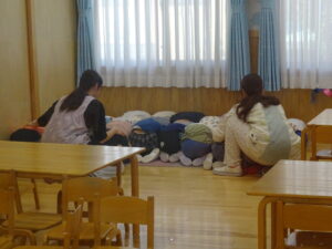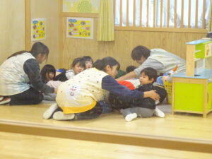 令和7年11月6日(木)保育園で不審者対応訓練を行いました。静かに不審者侵入の合図の放送が流れると、先生のお話しを聞きながらお部屋の隅に避難しました。頭を小さくしてじっと構えて避難していた子ども達です。部屋のなかを不審者がのぞき込み、「一緒にあそぼうよー。でてきてよー。」など、声をかけられても動じることなく、じっと我慢をして不審者がいなくなるのを待つことができました。園内放送で、不審者がいなくなったことを伝えると、ホッとした表情に。怖かったけど、よく頑張りましたね。今後も、訓練の大切さを伝えていき、子ども達が安全に、元気に楽しく園生活が送れるよう努めていきたいと思います。