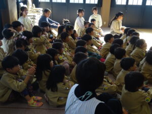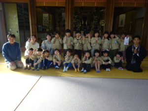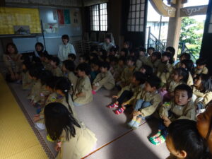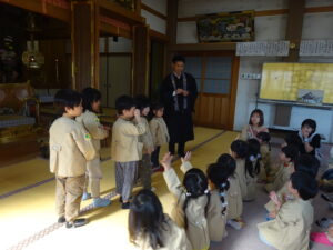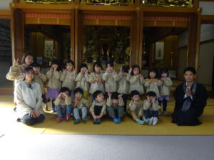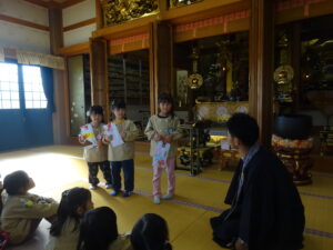 令和7年11月14日(金)ばら・ゆり・さくら組のお友だちで順勝寺に七五三のお詣りに出かけました。若葉第三幼稚園の園長先生が来てくださり、クラスの代表のお友だちが質問したことについてお話していただきました。「どうして、千歳飴はながいの?」「ののさまはどんな姿をしているの?」や、第三幼稚園の園長先生の袈裟姿をみて、「住職はどんなことをするの?」と興味を持っていたお友だちもいました。さくら組のお友だち数名がお焼香でお詣りもしました。お焼香のにおいがののさまは大好きなんだということも教えていただきました。制作した千歳飴の袋をみんなで披露し合ったり、厳かな本堂で素敵な時間を過ごすことができました。子ども達みんなが、この先も健やかに大きく成長することを願っています。