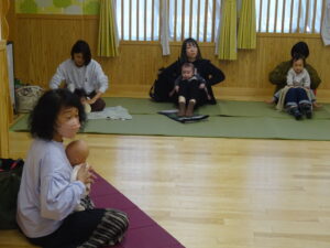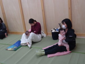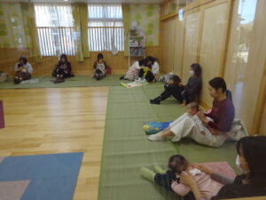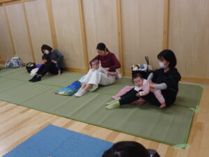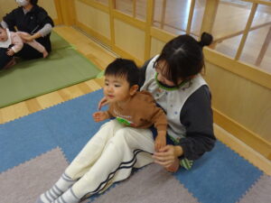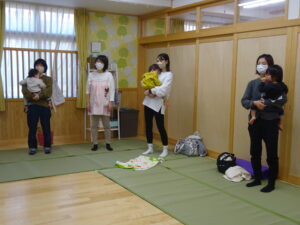 令和7年12月9日(水)親子であそぼう!未就園児さんの親子を対象に、12月の親子教室を開催しました。今回は、ベビーヨガアソシエイト認定インストラクターの加藤理香さんこと・かりんとうせんせいにご指導いただきました。身体を整えながら、赤ちゃんの育ちを感じることに意識をもちながら先生の動きをまねてヨガに参加させていただきました。お母さんの為のヨガもあり、姿勢に気を付けながら、集中して参加されている様子がありました。先生から、赤ちゃんを抱くときのコツ手の使い方などを教えて頂いたり、その他にも、子育てをしていくうえで参考になる事をたくさん教えていただきました。