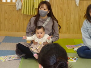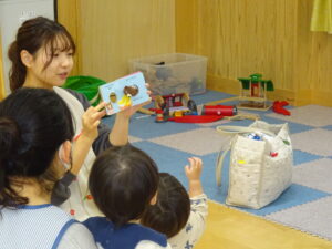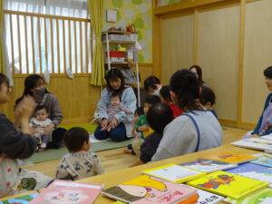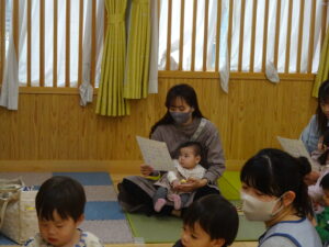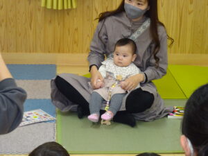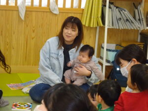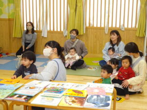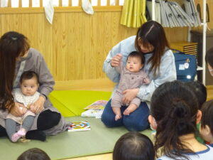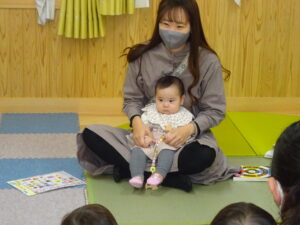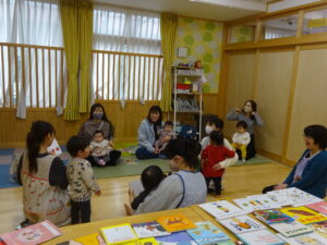 令和8年2月27日(金)の親子であそぼう!は「絵本の読み聞かせ」でした。未就園児のお友だちが親子で参加してくれました。沢山の絵本が机の上に並べられ、年齢にあった絵本の紹介や、絵本の魅力について語り合ったり、保育園のひよこ組さんも参加して担任の先生の読み聞かせで、ひよこ組0歳児の大好きなの紹介もさせていただきました。その様子を、お母様たちも笑顔で見守ってくださっていましたね。親子の大切なコミュニケーションの時間や、創造性・表現力・言葉の獲得等、絵本の魅力は沢山です。保育園でも絵本は大切な時間です。ご家庭でも、是非絵本の時間を作り、一緒に楽しんでくださいね。