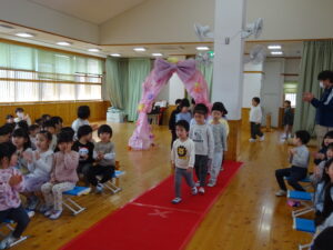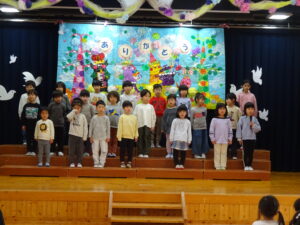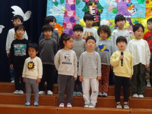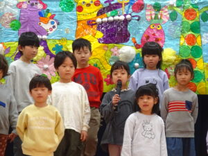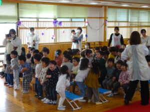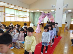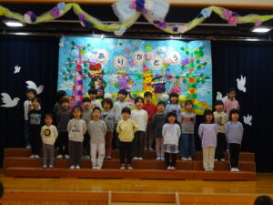 令和8年3月18日(水)ホールでお別れ会がありました。お花のアーチをくぐってさくら組さんが入場しました。そのまま舞台に上がり保育園のお友だちを見つめるさくら組さんはとても凛々しく見えましたよ。自分の名前、小学校で頑張りたいことを立派に発表することができました。「さよならぼくたちのほいくえん」のうたも聞かせてくれました。歌声と共に、様々な思い出がよみがえり、目頭をぬぐう保育者も。そして、もも組・ばら組・ゆり組のお友だちからお別れのプレゼント渡しがありました。