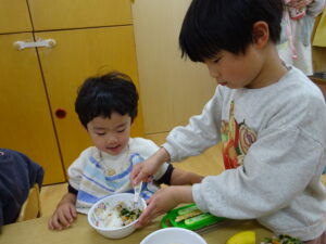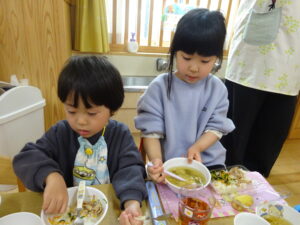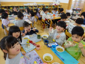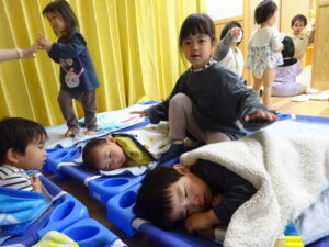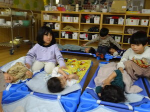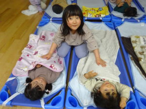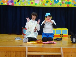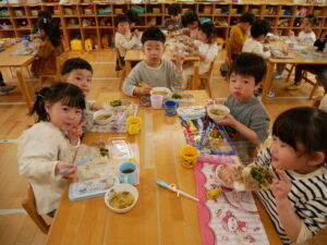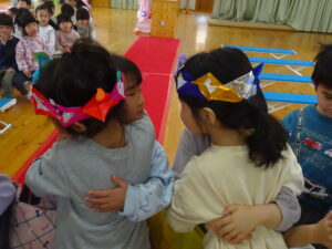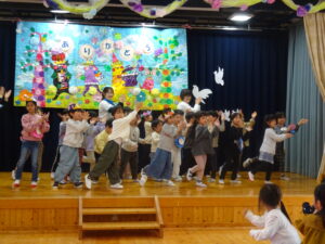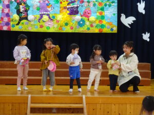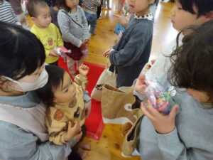 小さいお友だちから順番に手渡しして、さくら組さんとギュッと抱き合い、お互いに照れくさそうにしていましたが、素敵な思い出ができましたね。手提げ袋いっぱいのプレゼントで、さくら組さんはとっても嬉しそうでした。そして、先生からのプレゼントアトラクションは「だいすきがいっぱいの一年」で、楽しかった一年間を振り返った先生たちの劇でした。運動会で踊ったAPTや音楽会でのプペルの音楽が流れると、みんなで踊りだし、大盛り上がりでした。お別れ会の後も、さくら組さんが各お部屋でお給食をたべました。一緒に食べるのも今日で最後。もも0・1組のお友だちの寝かしつけのお手伝いもして、たくさん触れ合うことができた大切な時間となりました。