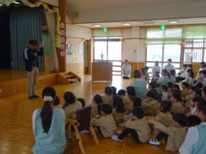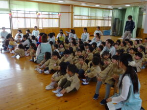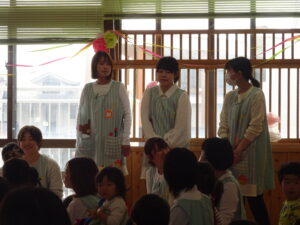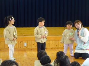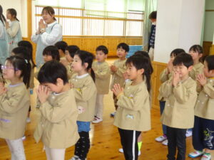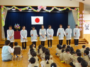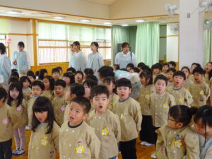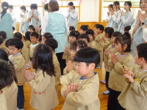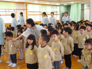 いよいよ新年度、令和8年度がスタートしました。令和8年4月6日、ホールで進級式が行われました。保育園みんなで集まったお集まりは今日が初めてです、若葉保育園のうた、朝のうたをみんなで一緒に歌いましたよ。園長先生からは、お話とあわせて担任の先生を紹介していただきました。大好きな先生が前に立つと「○○せんせい~!!」と大きな声で呼びかけている姿がありました。ばら・ゆり・さくら組の代表のお友だちが一人ずつ前にでて、新しいクラスで楽しみにしていること、頑張りたいことを発表してくれました。「英語教室を頑張りたい」「絵を描くことをがんばる!」「運動会で大繩をがんばりたい!」と大きな声で発表してくれました。今年度も色々なことを、みんなで一緒に楽しみましょうね!