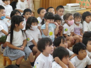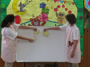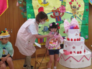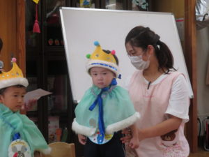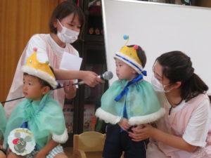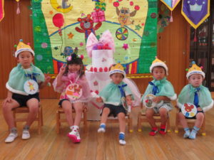 8月生まれのお誕生会 2020.09.03 8月24日(月)8月生まれのお誕生会がありました。みんなの拍手のお出迎えにニコニコと嬉しそうなお誕生児のお友達でしたよ。 先生からのプレゼントアトラクションは「3匹のヤギのガラガラドン」のお話です。トロルとヤギたちのやり取りを楽しんでいました。 < >