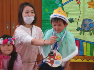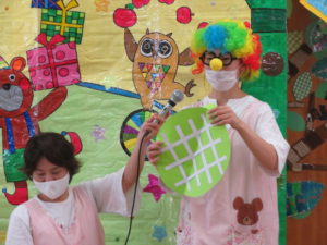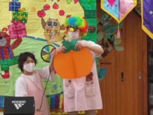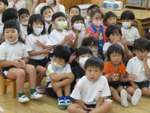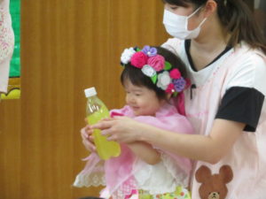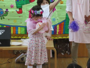 9月生まれのお誕生会 2020.09.18 9月16日(水)9月生まれのお誕生会がありました。沢山の拍手のお祝いに恥ずかしそうにしていた誕生児のおともだちでした。先生からのプレゼントは、「何ができるかな?」のクイズ遊びです。博士に変身した先生と一緒に歌を歌いながら楽しく遊ぶことができました。誕生児のお友達は一人ずつ博士のお手伝いもにも挑戦しましたよ。クイズに正解するとみんなとっても嬉しそうでした。 < >