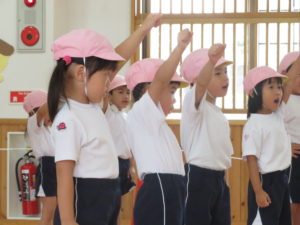 最後まで、子ども達への温かいご声援、ありがとうございました。沢山のお家の方の前で緊張している様子も見られましたが、どの競技にも一生懸命に参加し最後まで頑張る子ども達の姿をご覧いただけたのではないかと思います。また、クラスのお友だちと一緒に参加し活動するこがとても楽しそうで子ども達のキラキラした笑顔がとても印象的な運動会となりました。トップバッターは年少ばら組さんです。