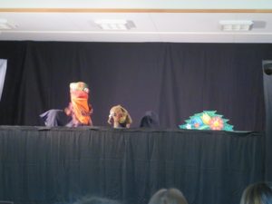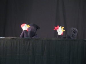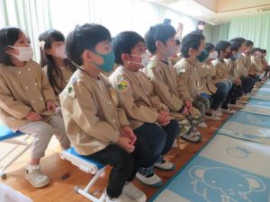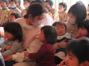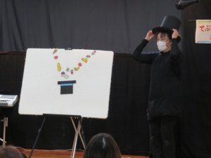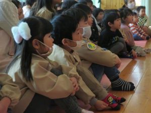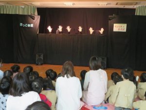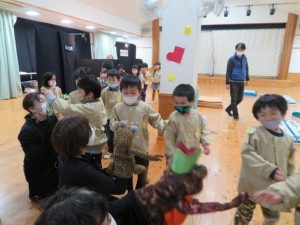 今年度のクリスマス会は「おっとめ座」のみなさんをお招きして、人形劇の公演を見せていただきました。会場に入ると、舞台のセットにまずびっくり!どんなお話が始まるのかみんなワクワクしていましたね。「手袋であそぼう」「不思議な帽子」のパネルシアター、「かえると牛」の3本立で、どのお話も音も一緒に楽しむことができました。最後はかえるや牛の人形と触れ合うことができ、とても嬉しそうでした。そして、お部屋にもどると、サンタさんからのプレゼントが届いており、みんなのキッラキラの笑顔が輝いていました。