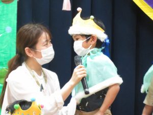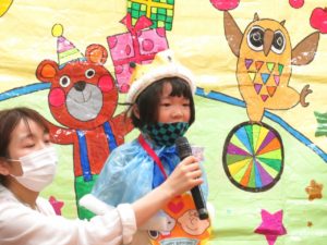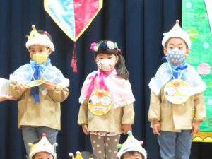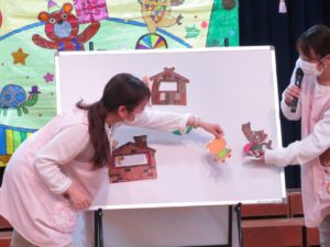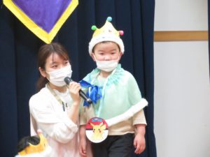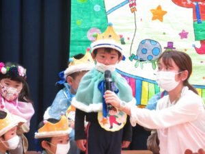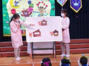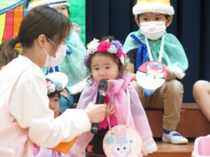 令和5月21日(金)ホールで5月生まれのお友達のお誕生会を行いました。5月は17人のお友達が一つ大きくなりました。大きいお友達は将来の夢や好きな遊びを堂々と発表することができました。小さいお友達も好きな食べ物を先生と一緒にお話ししてくれました。りんご・バナナ・納豆と色々な食べ物が出てきましたよ。先生からのお楽しみアトラクションは「三匹のこぶた」のパネルシアターです。知っているお話だったので場面場面楽しくお話しながら見入っていましたよ。