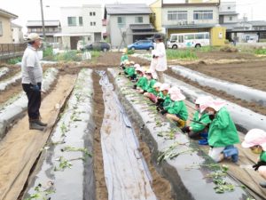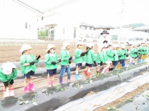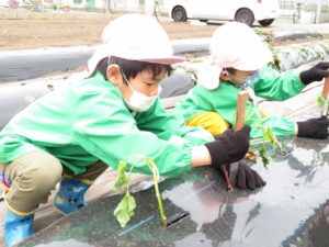 令和3年5月26日(水)さくら組のお友達でさつま芋の苗植えを行いました。若葉第一幼稚園さんや、第二幼稚園さんにお世話になり、バスで今年度初めての園外保育となりました。バスの中では、救急車が横を通ると拍手がわき起こり大変賑やかだったようです。お友達と一緒にのるバスはとっても楽しかったのですね。畑についてからはボランティアの方々のお話をよく聞いて上手に苗植えをすることができました。最後に「水やり、よろしくお願いします。ありがとうございました。」と挨拶をして帰りました。秋にたくさん収穫できるといいですね。