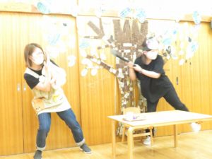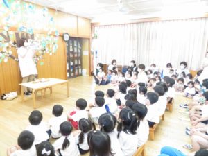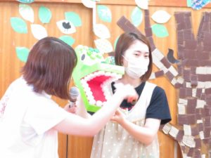 なかよし会 2021.07.03 令和3年6月17日(木)わかっばっこのお部屋でなかよし会を行いました。今月は正しい歯磨きのやり方についてみんなで話し合いました。最初は「バイキンどうぶつえんへ・・ようこそ」の紙芝居のお話をみました。バイキンが登場する場面では目を細め真剣な表情のお友達がいっぱいでしたよ。そのあとはワニくんと一緒に歯ブラシの動かし方や口のゆすぎ方の練習をしました。食べた後はしっかり歯磨きをして、虫歯にならないように気をつけましょうね。 < >