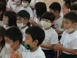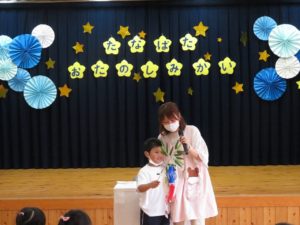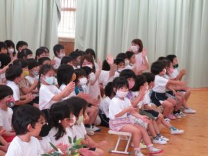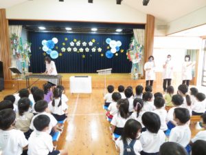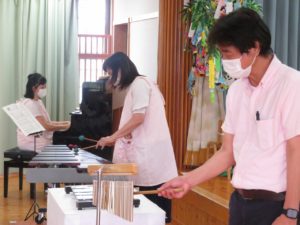令和3年7月7日(水)ホールで七夕お楽しみ会をおこないました。あいにくの空模様でしたが、織姫様彦星様のお話をペープサートで見たり、各クラスの七夕飾りを見せ合いっこしました。そして、スペシャルゲスト・音楽教室の白井先生をお招きして、一緒に七夕コンサートを楽しみました。「ビビデバビデブー!」の魔法の呪文でコンサートのはじまりはじまり!ミッキーマウスマーチをはじめとするディズニーメドレーで盛り上がりました。ほかにも、「道化師のギャロップ」というリズムのとても速いマリンバの演奏を聴かせていただき、音楽の世界に引き込まれましたね。アンコールの声援にもお応えいただき、とても楽しい七夕コンサートの時間をみんなで過ごすことができました。
