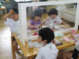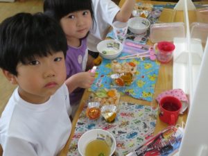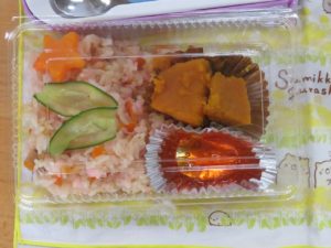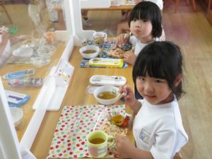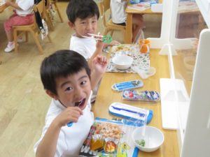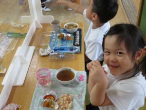 七夕お楽しみ会の後は、お楽しみ第二弾!七夕ランチデーです。この日のメニューは七夕すし・七夕そうめん汁・かぼちゃの煮物でした。おすしの上にはきゅうりやニンジンで彩られた天の川やお星さまが・・・「もったいないからたべたくな~い」というかわいい声も聞かれましたよ。デザートのゼリーも大盛況でした。