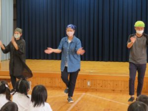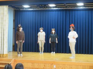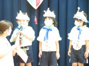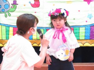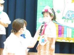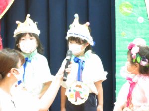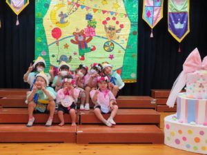 7月生まれのお誕生会 2021.08.02 令和3年7月27日(火)ホールで7月生まれのお誕生会を行いました。みんなとても上手に将来の夢や、すきな食べ物を発表してくれましたよ。先生たちからのプレゼントアトラクションは「ブレーメンの音楽隊」のオペレッタでした。リズミカルな音楽に合わせた踊りや、それぞれの登場人物の動きに夢中になっていましたよ。0歳児の一番小さなお友達も時折手拍子をしてよろこんでみてくれていました。 < >