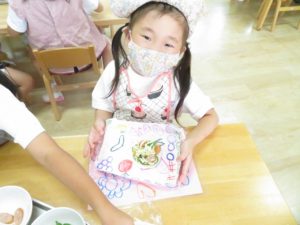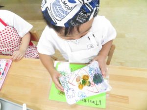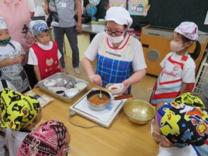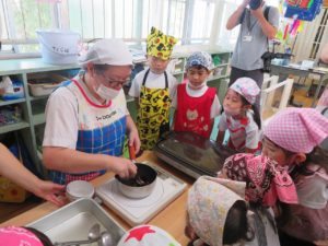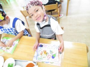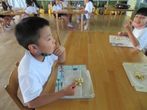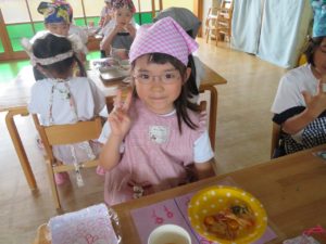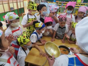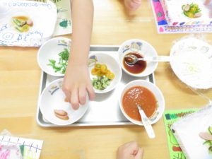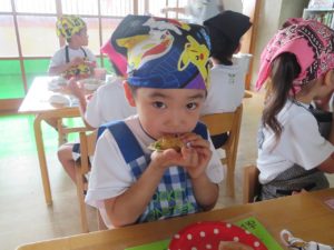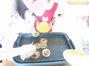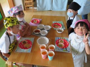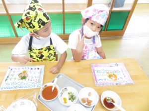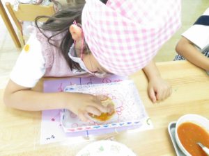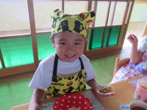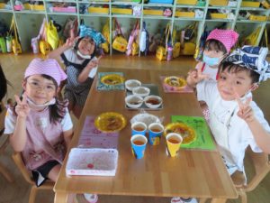 令和3年7月30日(金)さくら組さんが楽しみにしていた野菜パーティーが行われました。三角巾・エプロン・マスクを身につけ準備万端!!調理員さんにもソース作りに一緒に参加してもらいトマトソース・照り焼きソースの2種類のソースを作りました。ピザにのせる具材の準備も整い、それぞれ生地に好きな具材をのせピザつくりに夢中になっていましたよ。仕上げにチーズをのせ焼き上がりを待っていると、いい匂いに大興奮。事前にピザの注文を他のクラスの先生たちから受けていて、デリバリーごっこも楽しみました。「おいしかったよー!」と声を掛けられニッコニコのさくら組さん。さくら組さん、おいしいピザをありがとう!