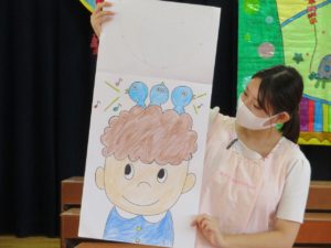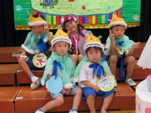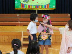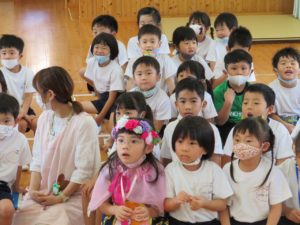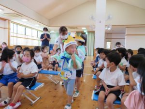 令和3年8月27日(金)ホールで8月生まれのお誕生会を行いました。温かい拍手のお祝いに包まれながら、ニコニコ笑顔で入場してきた誕生児のお友達です。お家の方からのお祝いのメッセージや担任の先生からのメッセージを照れくさそうに聞いていましたよ。先生からのプレゼントアトラクションは「お化けクイズ」「帽子の中にはなにがある?」の2つのクイズ遊びでした。ヒントで答えがわかると早く正解を知りたくて大盛り上がりでした。来月のお誕生会も楽しみですね。