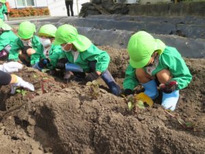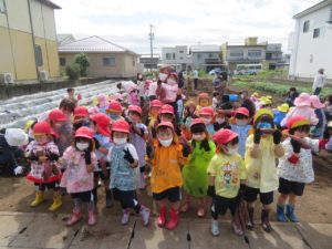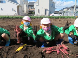 春にさくら組さんが苗植えしたさつま芋が収穫の時を迎え、令和3年10月18日・19日・20日、ばら組・ゆり組・さくら組のお友達がお芋ほりに行ってきました。今年度も若葉第一幼稚園さんにお世話になり、長森の農園まで行ってきましたよ。前日から「先生、明日はお芋ほり行くよね?」と、楽しみにしていた子ども達です。早速、土を掘ってみるとすぐにお芋が顔を出してくれ、「あったー!!」と大興奮。大きなお芋が出てくると「○○ちゃんのお顔よりおおきね~。」と会話も弾んでいました。たくさん収獲することができましたね。