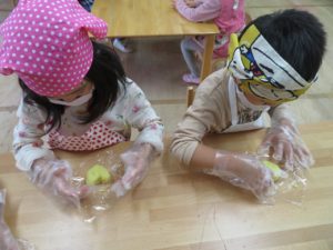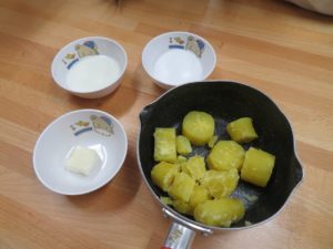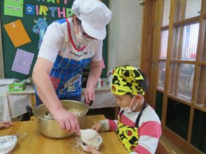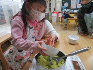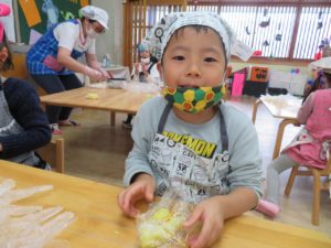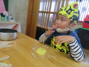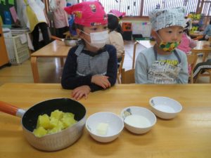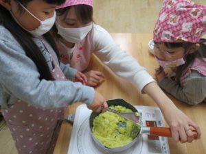 午後からはみんなでスイートポテトを作りました。蒸しあがったさつま芋にバター・砂糖・牛乳をまぜてこねこね。お星さまやハート、自分の好きな形にしあげ嬉しそうに見せに来てくれましたよ。「あまくておいし~!!」今日は一日クッキングデーで大満足のさくら組さんでした。