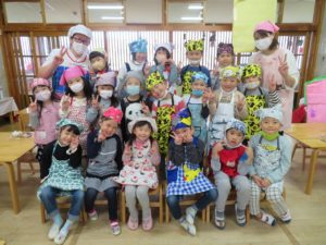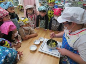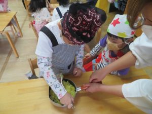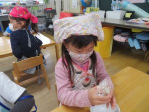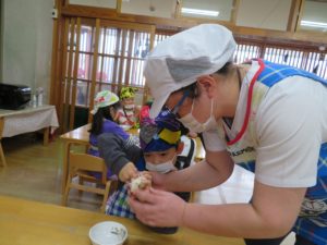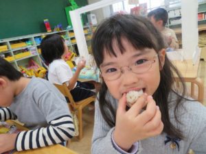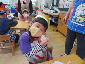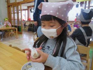 令和3年10月25日のランチデーにあわせて、さくら組のお友達がクッキングを行いました。午前中はおにぎりクッキングです。調理員さんが用意してくださったご飯とおにぎりの具材をよく混ぜ合わせ、ラップに包んでにぎにぎ。おかかおにぎりと、ハムチーズのおにぎりを作りましたよ。クラスのお友達と一緒に、また自分でにぎったおにぎりは格別においしかったようで、とびきりの笑顔で食事の時間を過ごしていました。