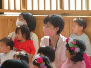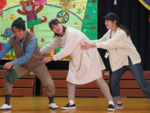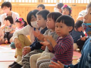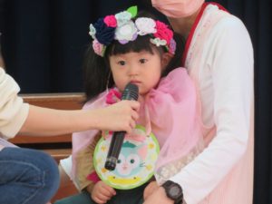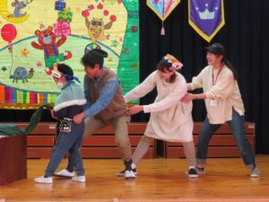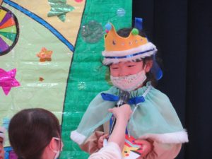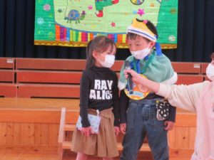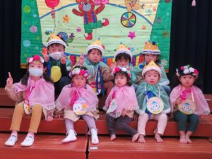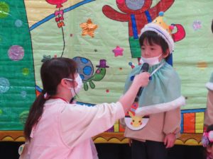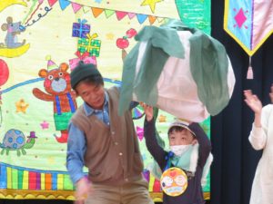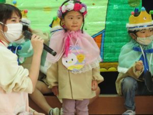 令和3年10月27日(水)10月生まれのお誕生会がありました。舞台の上からうれしそうにお友達に手を振る姿がありましたよ。大きいお友達は将来の夢や好きな遊びを発表してくれました。小さいお友達も、自分の名前や好きな食べ物を堂々と大きな声で発表してくれ、その成長した姿にみんなもとてもうれしそうでした。先生たちからのプレゼントアトラクションは「おおきなかぶ」の劇です。園長先生のお爺さん役にみんな大喜び。年長のお友達も劇に参加して大盛り上がりでしたね。