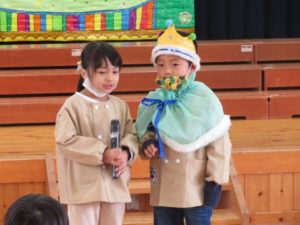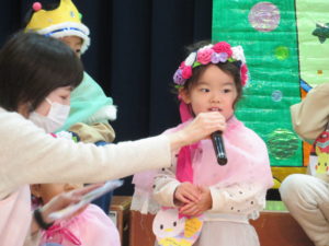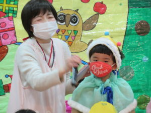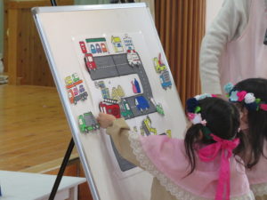 11月のお誕生会 2021.12.02 令和3年11月26日(金)11月生まれのお誕生会がありました。大きいお友達と小さいお友達が仲良く手をつなぎながら入場する姿がとてもかわいらしかったです。保育園のお友達や先生達からたくさんの拍手のお祝いにうれしそうにしていたお誕生児のお友達でした。先生からのプレゼントアトラクションはみんなの大好きな「はたらくくるま」のパネルシアターでした。歌に合わせて色々なはたらくくるまが登場しみんな大喜びでしたよ。 < >