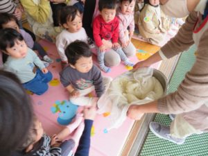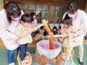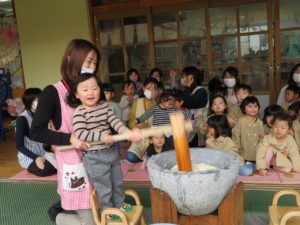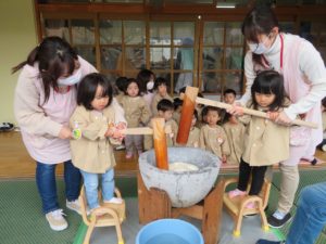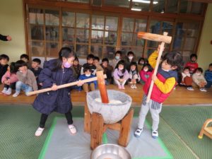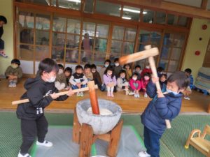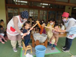 令和3年12月8日(水)保育園のお友達みんなでお餅つきをしました。調理員さんから蒸し上がったもち米が届くと、「いいにお~い!」とまずは香りを楽しんでいました。園長先生がうすの中でもち米をぐいぐいつぶします。さあ、順番にお餅つき開始です!!「ぺったん!ぺったん!」小さいお友達もかわいい掛け声をみんなにかけてくれましたよ。杵が重かったけど、先生にお手伝いしてもらいながら頑張りました。大きいお友達は、杵の持ち手をしっかり握り、力強くお餅をついていましたよ。