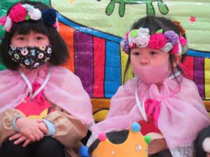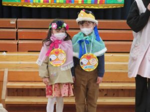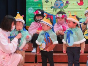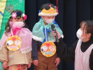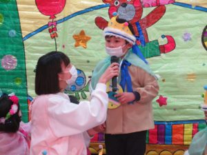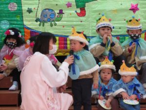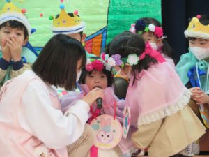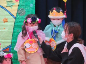 令和3年度の2.3月生まれのお誕生会を合同で行いました。たくさんのお誕生児のお友達が舞台の上に・・・とても賑やかなお誕生会になりました。もも組のお友達もマイクでお話しすることに慣れてきて、自分の名前や好きな食べ物を上手にお話ししてくれましたよ。今年度最後の先生たちからのプレゼントアトラクションは「お雛様たちも一緒にあそびたい!」の劇でした。女の子とお雛様たちのやり取りをとても喜び、ホールは笑いでいっぱいでした。