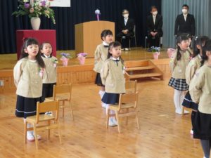 令和4年3月25日(金)は令和3年度の卒園式がホールで行われました。とてもよいお天気で、まるでさくら組さんの新しい門出をお祝いしてくれるような澄み切った青空でした。厳かな雰囲気の中、卒園証書を園長先生から受け取る姿はとても凛々しく胸が熱くなりました。さくら組さん、たくさんのすてきな笑顔をありがとう・・いつも小さいお友達に優しくしてくれてありがとう・・泣いたり、笑ったり、怒ったり、たくさんの思い出ができました。小学校に行っても、優しい心、チャレンジする勇気をもってキラキラの1年生になってください。