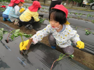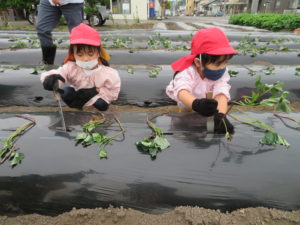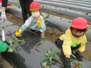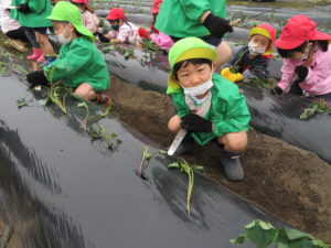 さつま芋の苗植え 2022.05.31 令和4年5月17日(木)ゆり・ばら組さんが幼稚園バスに乗って、さつまいもの苗植えにでかけました。農園のおじさんに、苗の植え方を教えていただき、コテを使って上手に苗を植えることができましたよ。秋の芋ほり遠足で収穫するのが今から楽しみですね。 < >