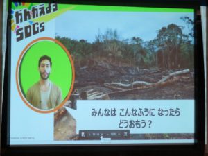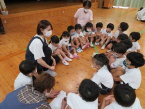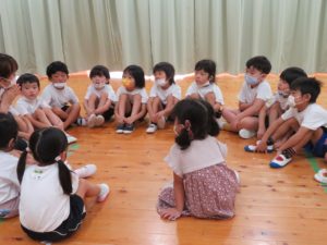 令和4年8月31日(水)ホールでゆり組・さくら組が参加して、第2回目のわかばっこEarthがありました。前回の続きで、虹色バズーカーのカプセルを集めるために世界中の人の声を集めに、ペンギンのスカイとゆり組・さくら組のお友達で今回はブラジルに旅に出かけましたよ。ブラジルではルーカスとお友達になり、色々な場所に案内してもらいました。お話の中で今、ブラジルではたくさんの木々が減ってしまい、動物たちの住む場所がなくなってきていることをしりました。また、貴重な動物を捕まえようとする人がいることも知りました。お話が終わってから、2つのグループに分かれて、どうすれば森がなくならないようにできるのか、動物たちを守ることができるのかをみんなで話し合いました。ゆり組さんも、さくら組さんもいろいろな意見を聞かせてくれましたよ。「木を切らないでと看板をたてる」「木の芽が出るように種をまいて、育てればいい。」「折れた枝をくっつけてあげる」「動物を連れて行こうとする人をみかけたら、警察を呼ぶ」「ネットを用意して、うえからかぶせて捕まえる」などなど。。。子どもたちなりに一生懸命考え伝えてくれました。なぜ、木が減ってきてしまっているのか?地球温暖化など、様々な問題があると思いますが私たちの身近な問題としてとらえ、子ども達と共有していけたらと思います。