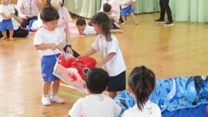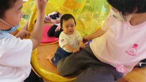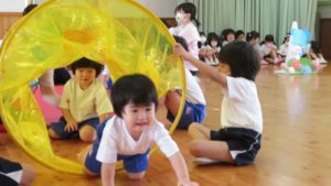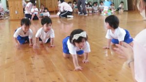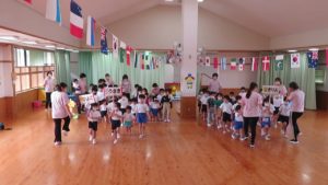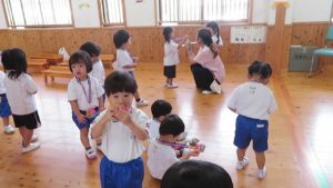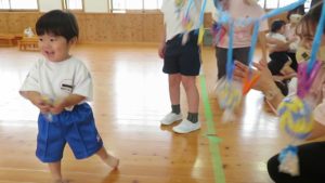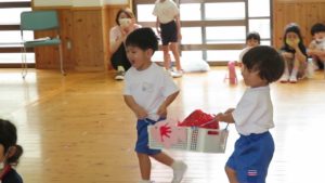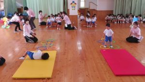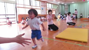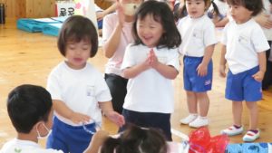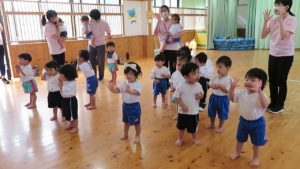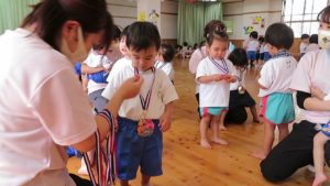 令和4年9月21日(水)待ちに待ったもも組さんの運動会を開催することができました。大きいクラスのお友達が応援やお手伝いに駆け付け、一緒に体操にも参加してくれました。みんなの大好きな「ワイワイ運動会」の踊りは保育園全体がひとつになり、いつもとは違う雰囲気で緊張や戸惑いもありましたが、運動会を経験し、体を動かしたりお友達と一緒に楽しさを十分に味わうことができました。クラスごとに2種類の種目に取り組み、元気いっぱいに頑張ったもも組の子ども達です。閉会式では、先生から一人ずつメダルをかけてもらうと、とっても嬉しそうにしていました。