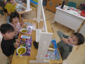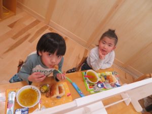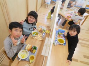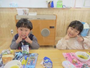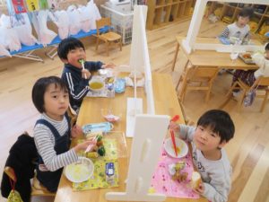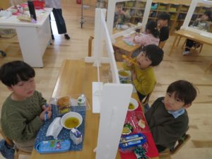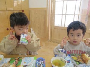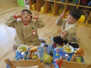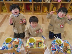 ランチデー 2022.12.28 令和4年12月22日(木)のお昼はランチデーで、大きいクラスのお友達はお弁当に、小さいクラスのお友達はワンプレートにしてもらいいただきましたよ。残念ながら寒さでテラスに出ることはできませんでしたが、お部屋の中をいつもと違う机の配置に変え、雰囲気を変えて楽しみました。みんなの大好きなから揚げのメニューだったのであっという間に食べ終わっていましたよ。 < >