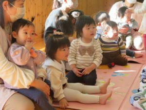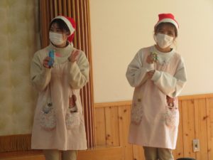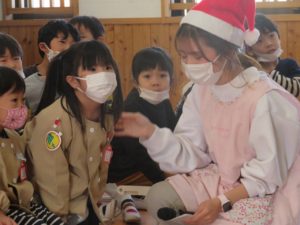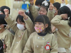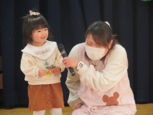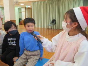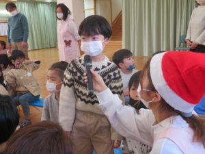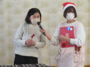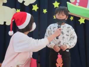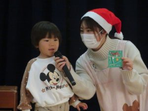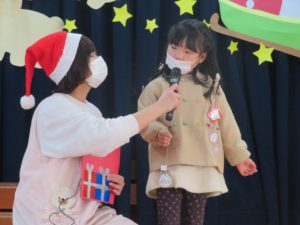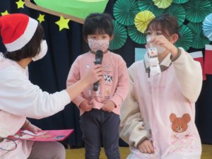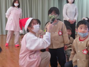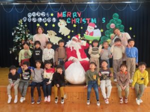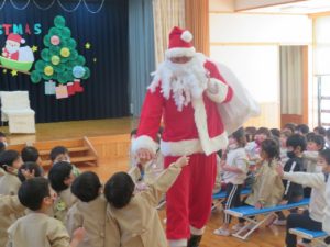 令和4年12月23日(金)ホールでクリスマス会がありました。もも組のお友達は初めてのクリスマス会にドキドキの様子。さくら組のお友達の始まりの言葉で会がスタートしました。最初にみんなが作ったクリスマス飾りを各クラスの代表のお友達が発表してくれました。もも組の小さなお友達も上手にお話してくれましたよ。そして、スペシャルゲスト・音楽教室の白井先生が駆けつけてくださり、クリスマスミニコンサートでマリンバの演奏を聴かせてくれました。「ジングルベル」「きよしこの夜」「ウイリアムテル」をメドレーにしての演奏で、タンブリン・鈴・ツリーチャイムは園長先生担当で、みんなでリズムに乗り楽しいひと時を過ごすことができました。そして、静かに鈴の音がきこえてくると、なんとサンタさんが登場!!拍手でお迎えしたり歓声をあげて喜ぶ姿がありました。ここでもサンタさんに色々な質問をしましたよ。さくら組さんはサンタさんと一緒に記念撮影もして仲良しになりましたね。お部屋に戻るとサンタさんからのプレゼントが。。。これにも驚き、中身をこっそり見てはみんなで喜んでいました。