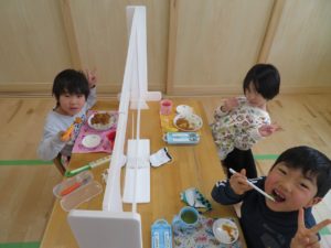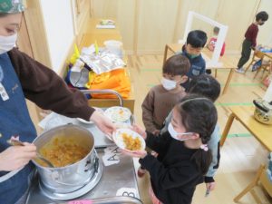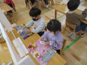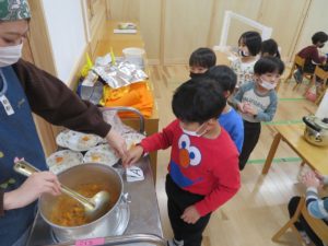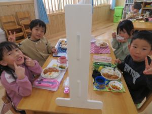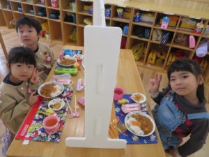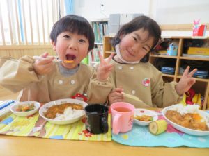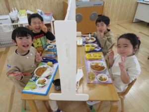 1月のランチデー 2023.01.30 令和5年1月23日(月)はランチデーでした。前回好評だったカードを選び、引いたカードのお給食を頂きました。この日のメニューはハヤシライスです。ハヤシライスに星とハートの切り抜きの人参が飾られています。Aが星・Bがハートの切り抜きです。「ハートがいいなー。」「どっちでもかわいい!」と意見は様々でしたが、カードを引くときはみんな真剣でしたよ。普段人参が少し苦手なお友達も今日は笑顔でお友達と一緒に給食を食べていましたよ。 < >