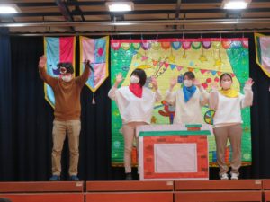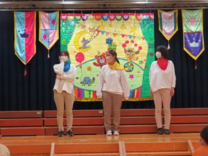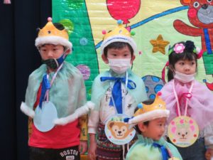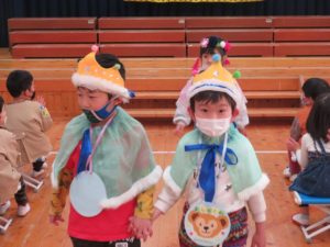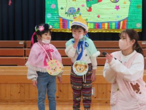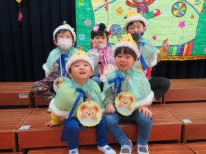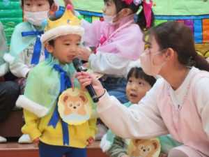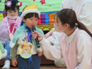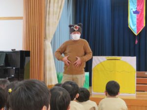 令和5年1月26日(木)は1月生まれのお誕生会がありました。みんなの拍手のお祝いに照れながらの入場でしたが、舞台に立つと、大きいお友達は将来の夢で「宇宙飛行士」「お花屋さん」などを堂々とお話してくれました。小さいお友達も自分の名前や好きな食べ物を大きな声で上手にお話してくれました。先生からのプレゼントアトラクションは「3匹のこぶた」の劇でした。今回はオオカミ役に園長先生が登場しみんな大喜びでした。こぶたと狼のやり取りがとても面白くホールは笑い声でいっぱいでしたよ。
