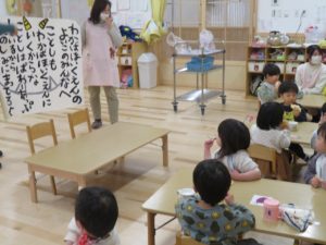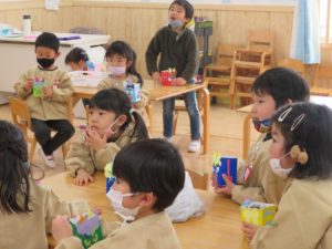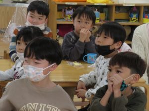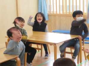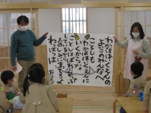 鬼の手紙 2023.01.30 先日、保育園に鬼からのお手紙が届きました。とてもおおきな手紙で紙には鬼の角やおおきな口が描かれていて、とても迫力がありました。さくら・ゆり組のお友達は自分たちで手紙の内容を読んでいましたよ。元気に鬼退治ができるように「おにはーそと!、ふくはーうち!」とみんなで練習もしました。豆まき当日、無事に鬼退治ができますように・・・・。 < >